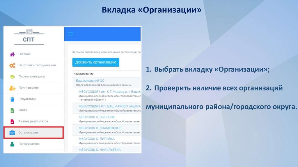 Вкладка «Организации»1. Выбрать вкладку «Организации»;
