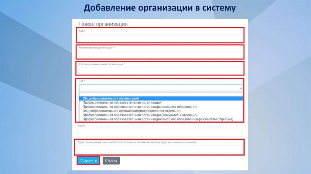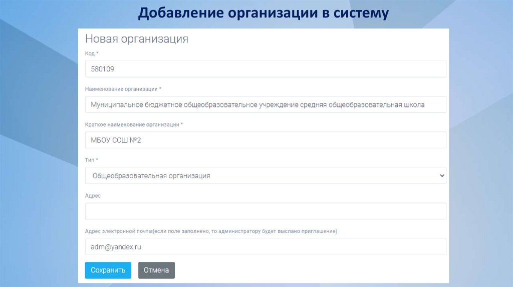 Добавление организации в систему8.