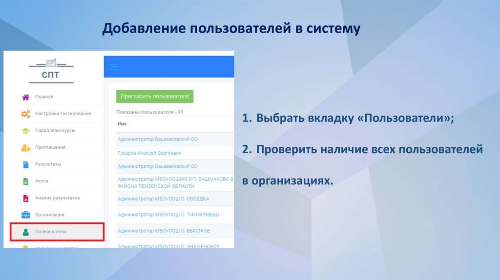 Добавление пользователей в систему1. Выбрать вкладку «Пользователи»;