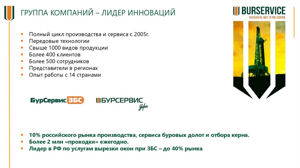 10% российского рынка производства, сервиса буровых долот и отбора керна.