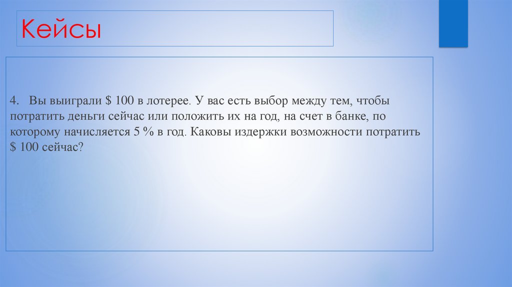 Кейсы4. Вы выиграли $ 100 в лотерее. У вас есть выбор между тем, чтобы