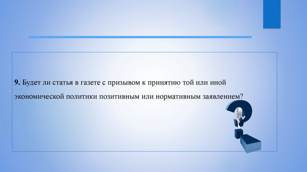 9. Будет ли статья в газете с призывом к принятию той или инойэкономической политики позитивным или нормативным заявлением?