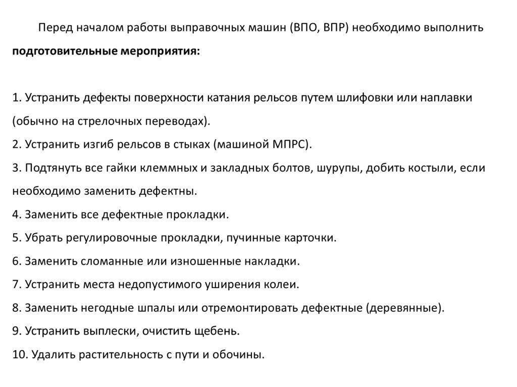 Перед началом работы выправочных машин (ВПО, ВПР) необходимо выполнитьподготовительные мероприятия: