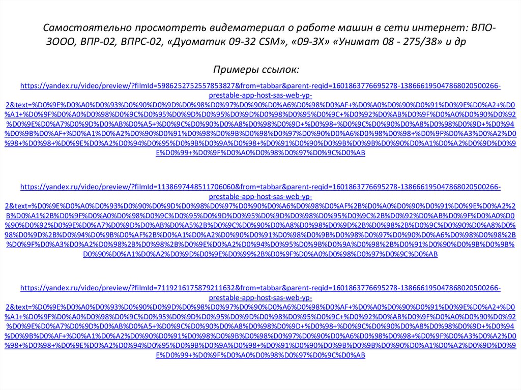 Самостоятельно просмотреть видематериал о работе машин в сети интернет: ВПОЗООО, ВПР-02, ВПРС-02, «Дуоматик 09-32 CSM», «09-ЗХ» «Унимат 08 - 275/38» и дрПримеры ссылок: