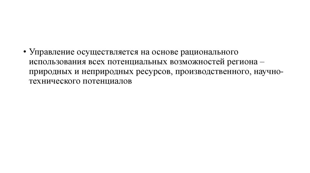 • Управление осуществляется на основе рациональногоиспользования всех потенциальных возможностей региона –