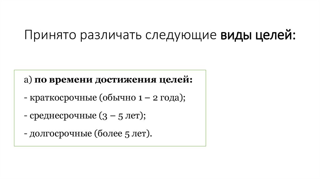 Принято различать следующие виды целей:а) по времени достижения целей: