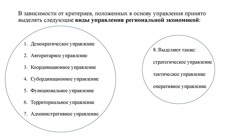 В зависимости от критериев, положенных в основу управления принятовыделять следующие виды управления региональной экономикой: