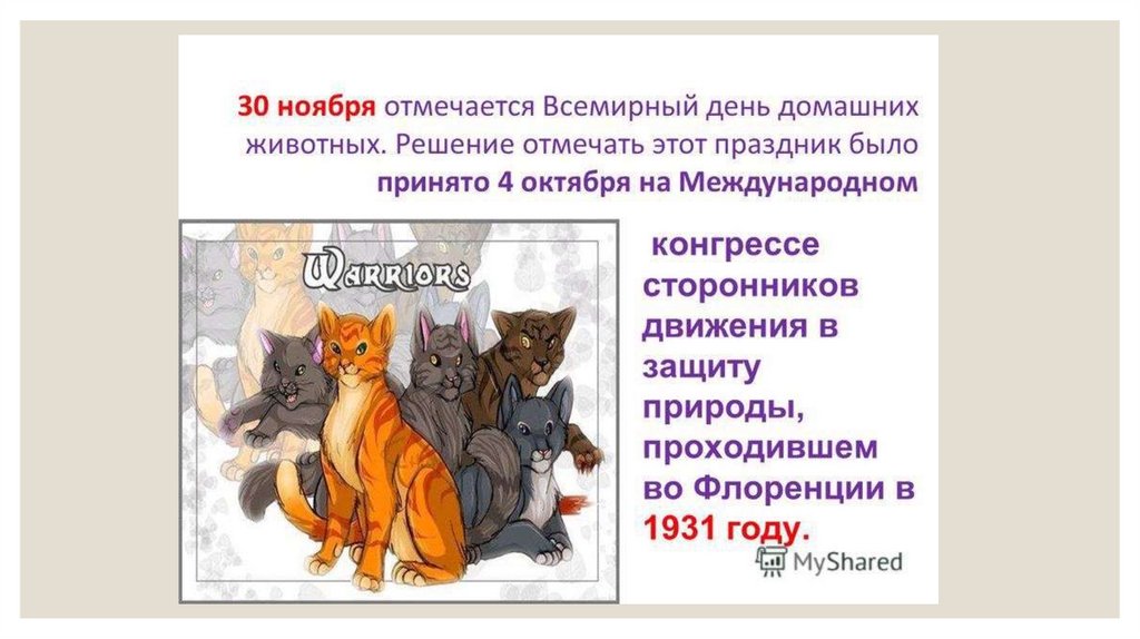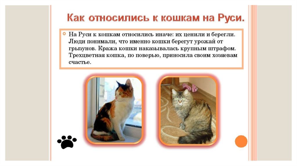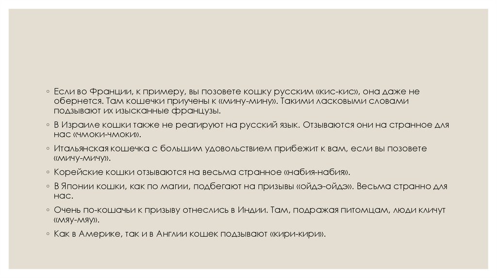 ◦ Если во Франции, к примеру, вы позовете кошку русским «кис-кис», она даже необернется. Там кошечки приучены к «мину-мину». Такими ласковыми словами