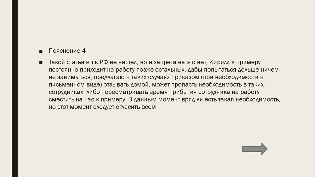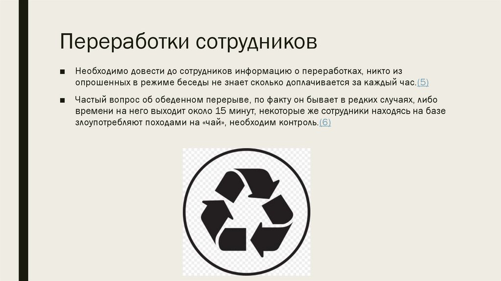 Переработки сотрудников■ Необходимо довести до сотрудников информацию о переработках, никто из