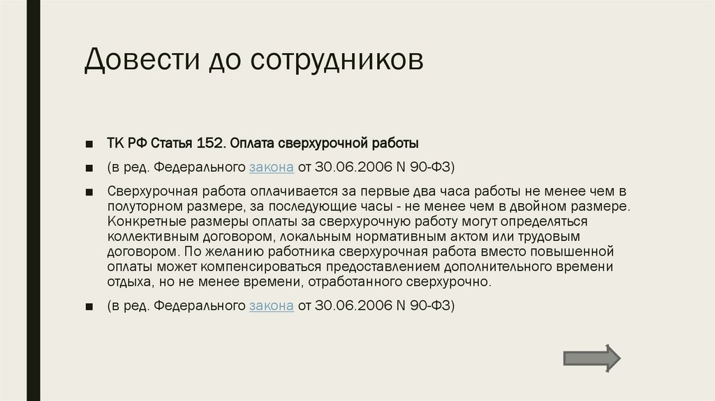 Довести до сотрудников■ ТК РФ Статья 152. Оплата сверхурочной работы
