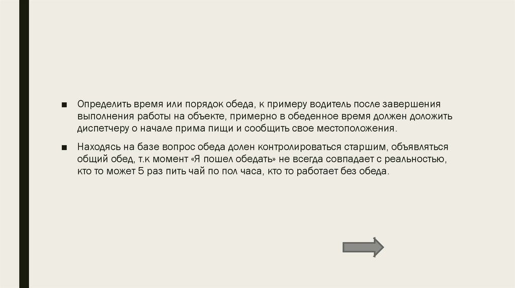 ■ Определить время или порядок обеда, к примеру водитель после завершениявыполнения работы на объекте, примерно в обеденное время должен доложить