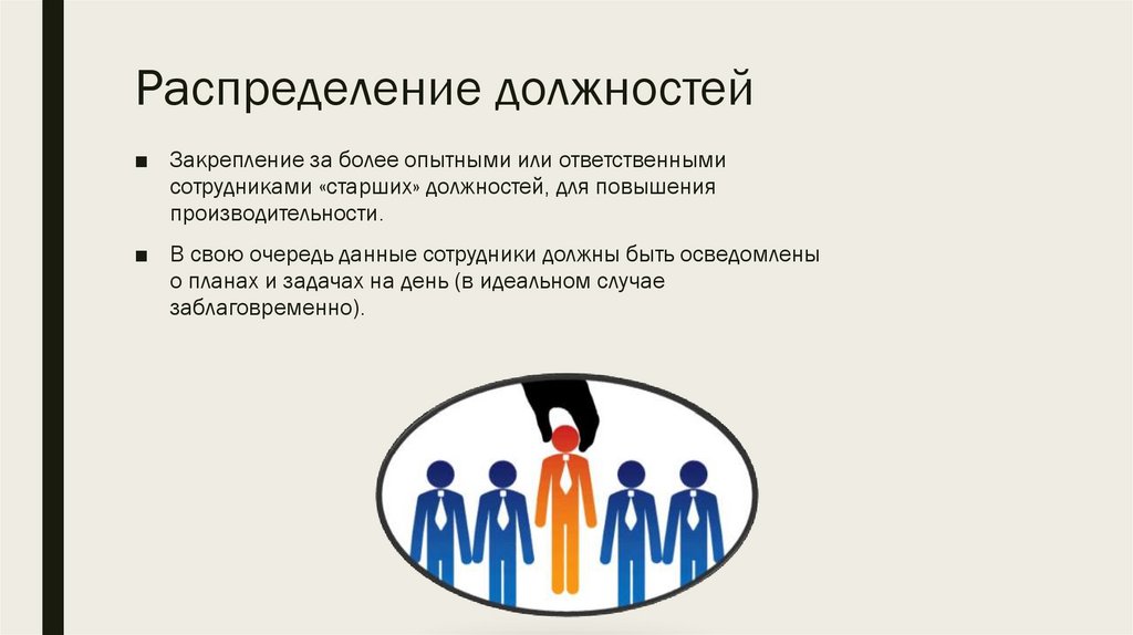 Распределение должностей■ Закрепление за более опытными или ответственными