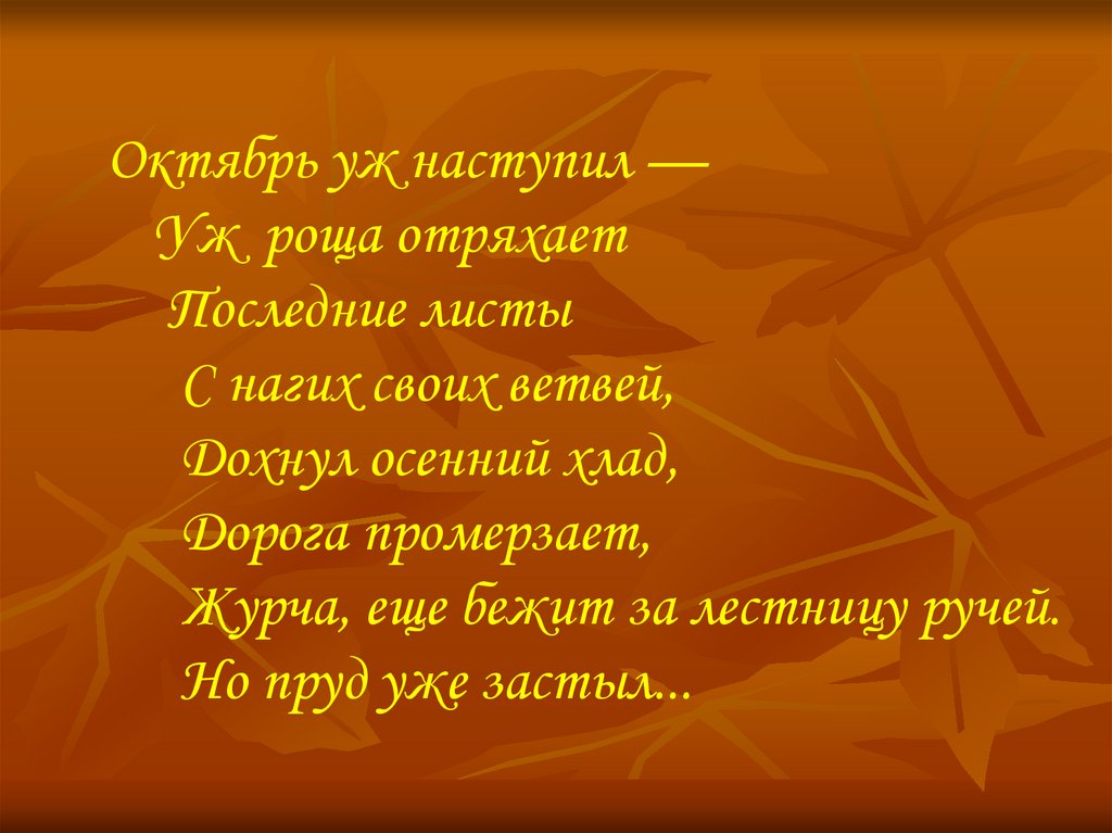 Октябрь уж наступил —Уж роща отряхает