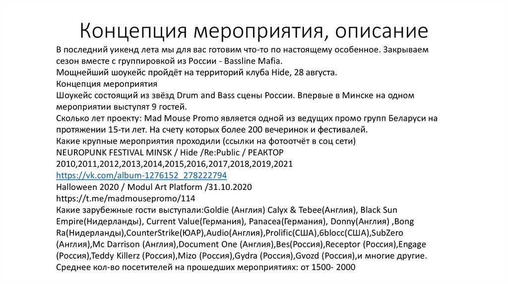 Среднее кол-во посетителей на прошедших мероприятиях: от 1500- 2000