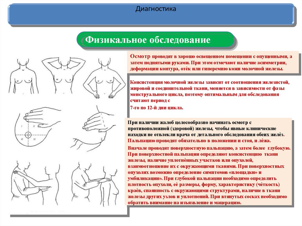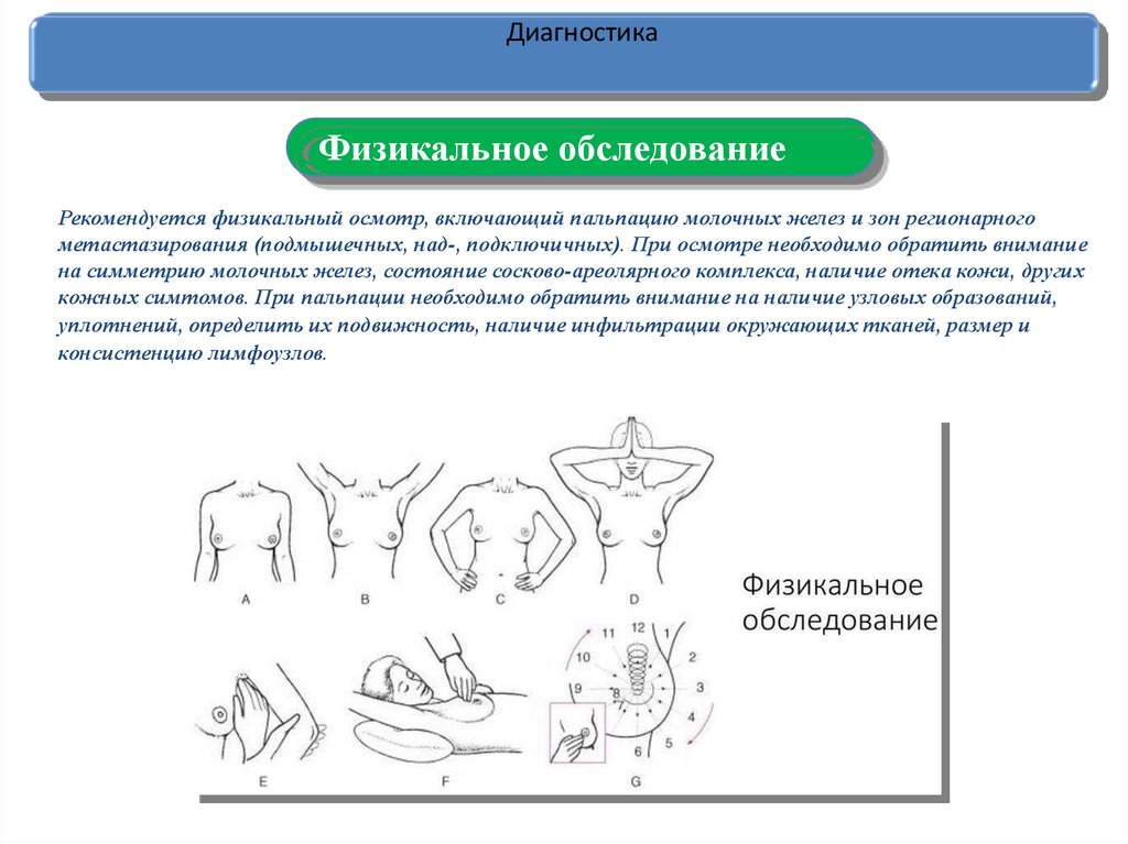 Рекомендуется физикальный осмотр, включающий пальпацию молочных желез и зон регионарного