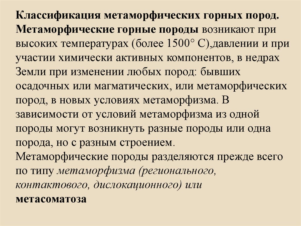 Классификация метаморфических горных пород.Метаморфические горные породы возникают при