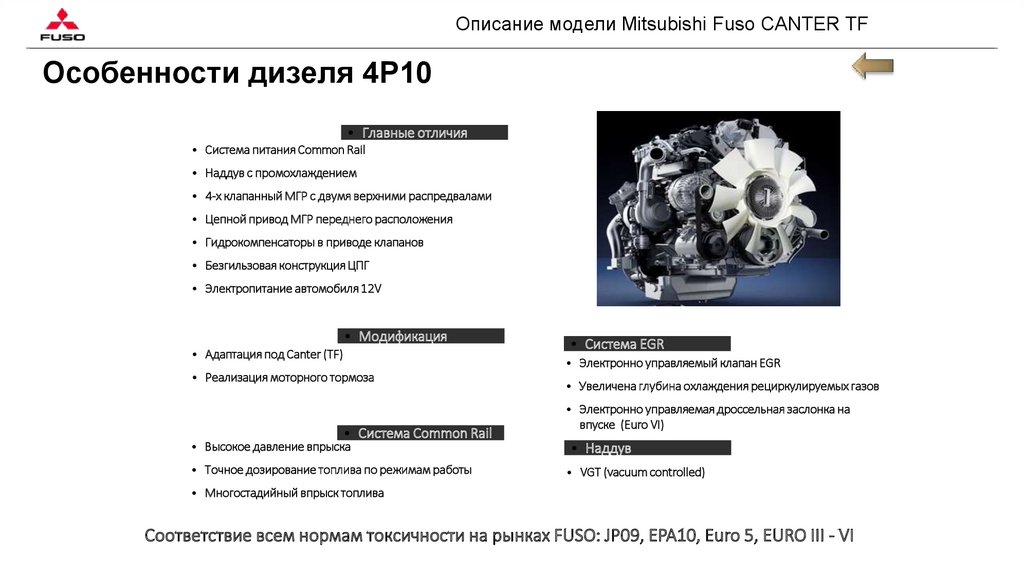 Соответствие всем нормам токсичности на рынках FUSO: JP09, EPA10, Euro 5, EURO III - VI