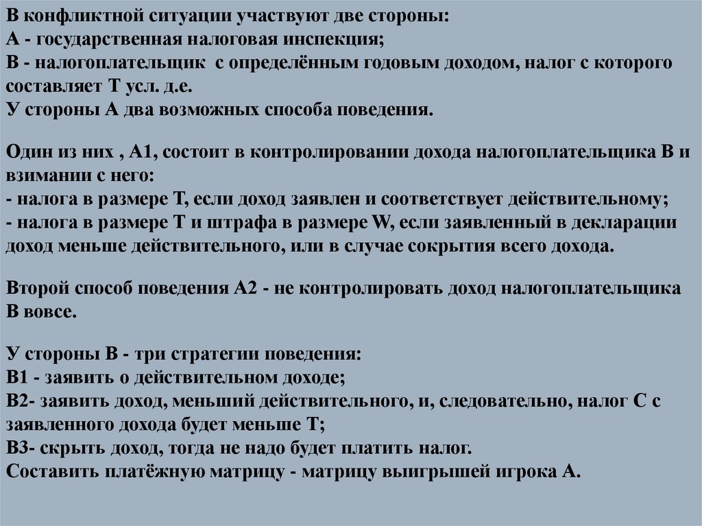когда игрок А- налоговая инспекция - придерживается чистой стратегии