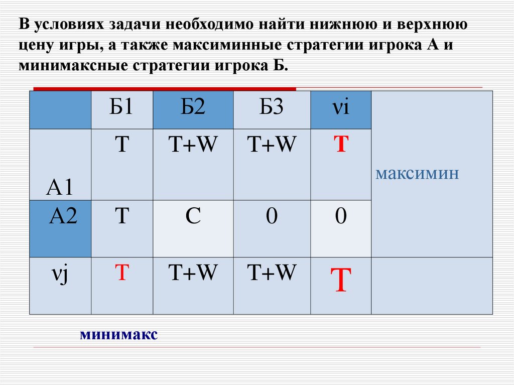 В условиях задачи необходимо найти нижнюю и верхнююцену игры, а также максиминные стратегии игрока А и