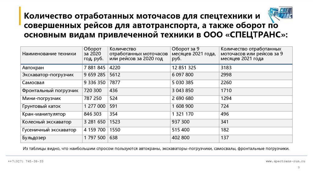 Из таблицы видно, что наибольшим спросом пользуются автокраны, экскаваторы-погрузчики, самосвалы, фронтальные погрузчики.