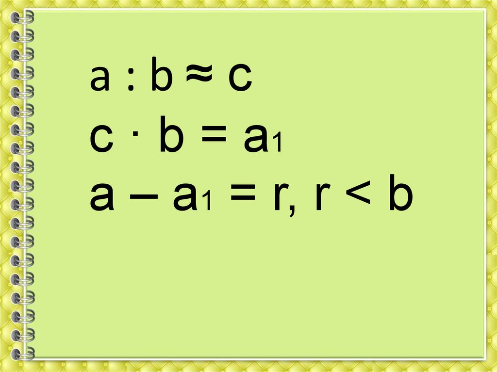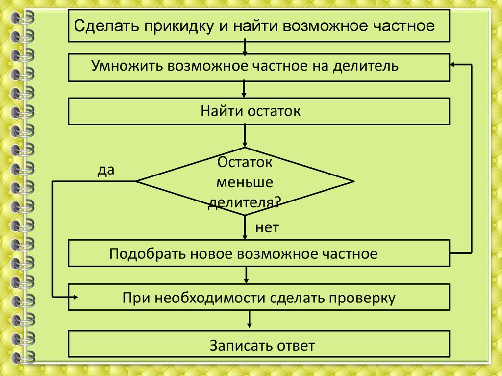 Сделать прикидку и найти возможное частноеУмножить возможное частное на делитель