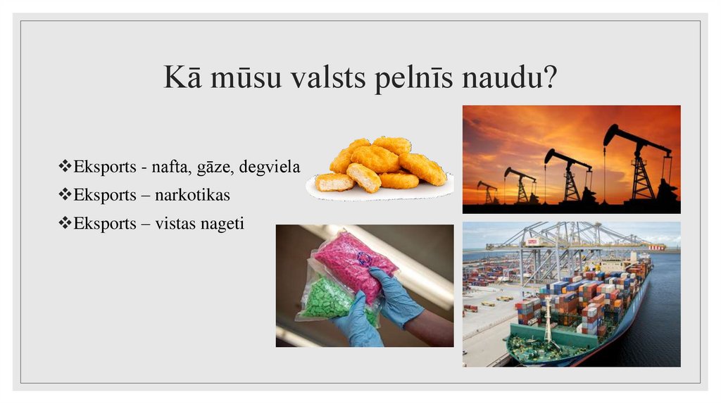 Kā mūsu valsts pelnīs naudu?Eksports - nafta, gāze, degviela