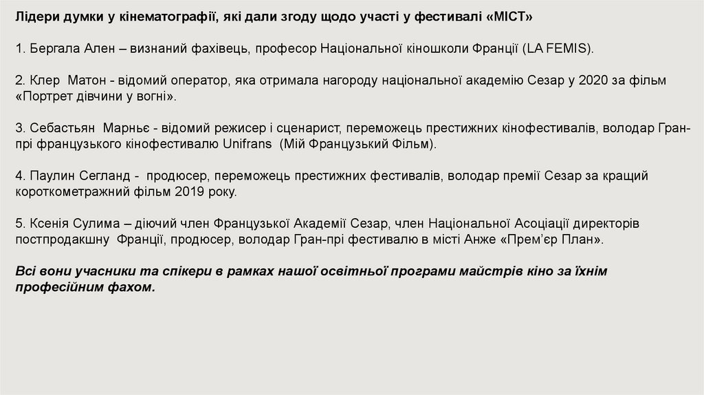 Лідери думки у кінематографії, які дали згоду щодо участі у фестивалі «МІСТ»1. Бергала Ален – визнаний фахівець, професор Національної кіношколи Франції (LA FEMIS).