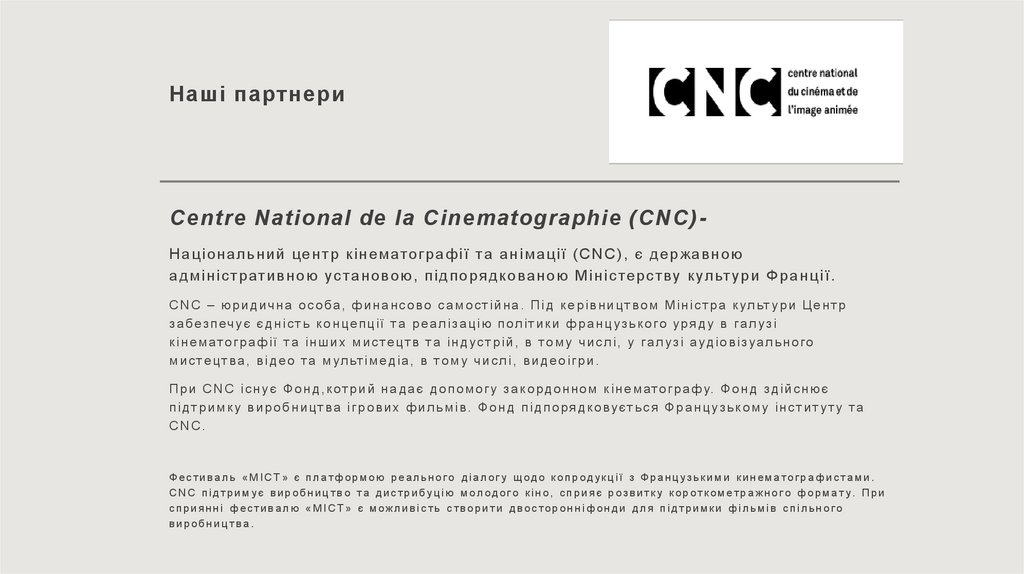 Наші партнериCentre National de la Cinematographie (CNC) Н а ц і о н а ль н и й ц е н т р к і н е м ато г р а фі ї т а а н і м а ц і ї ( C N C ) , є д е р ж а в н о ю