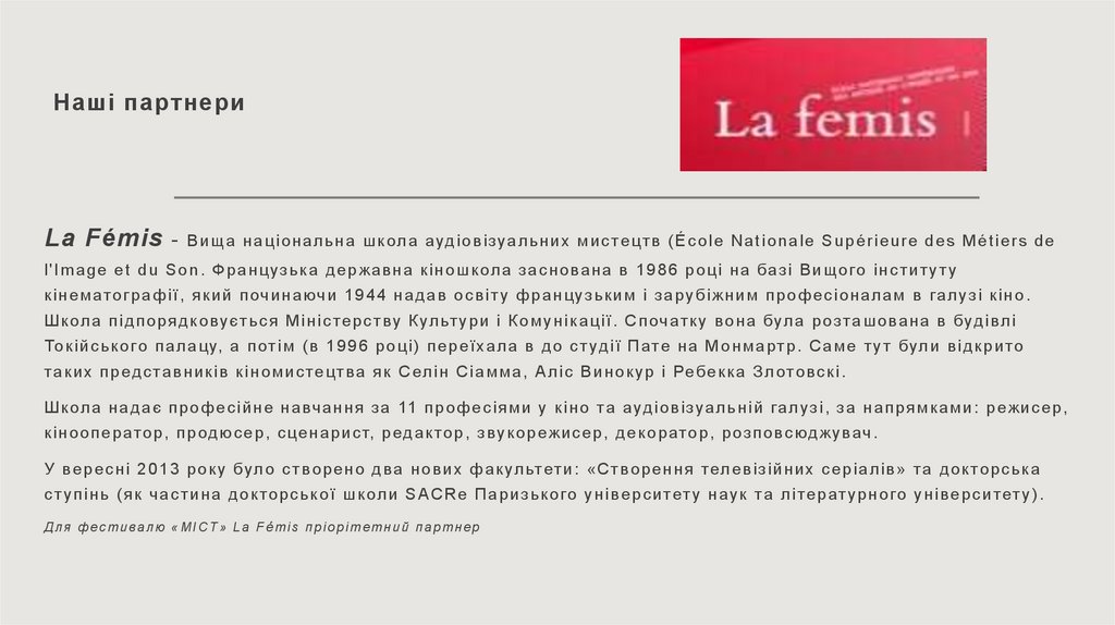 Для фестивалю «МІСТ» La Fémis пріорітетний партнер