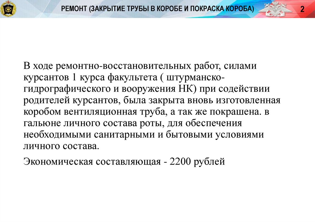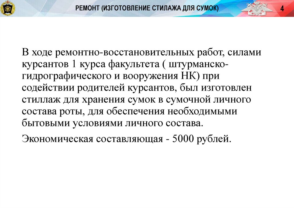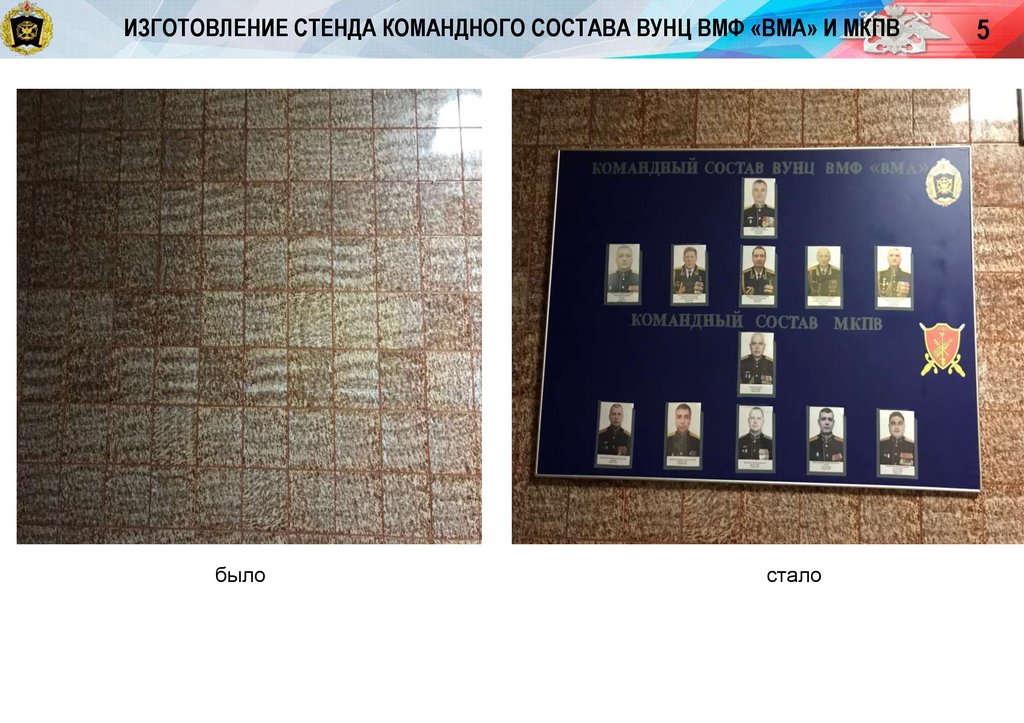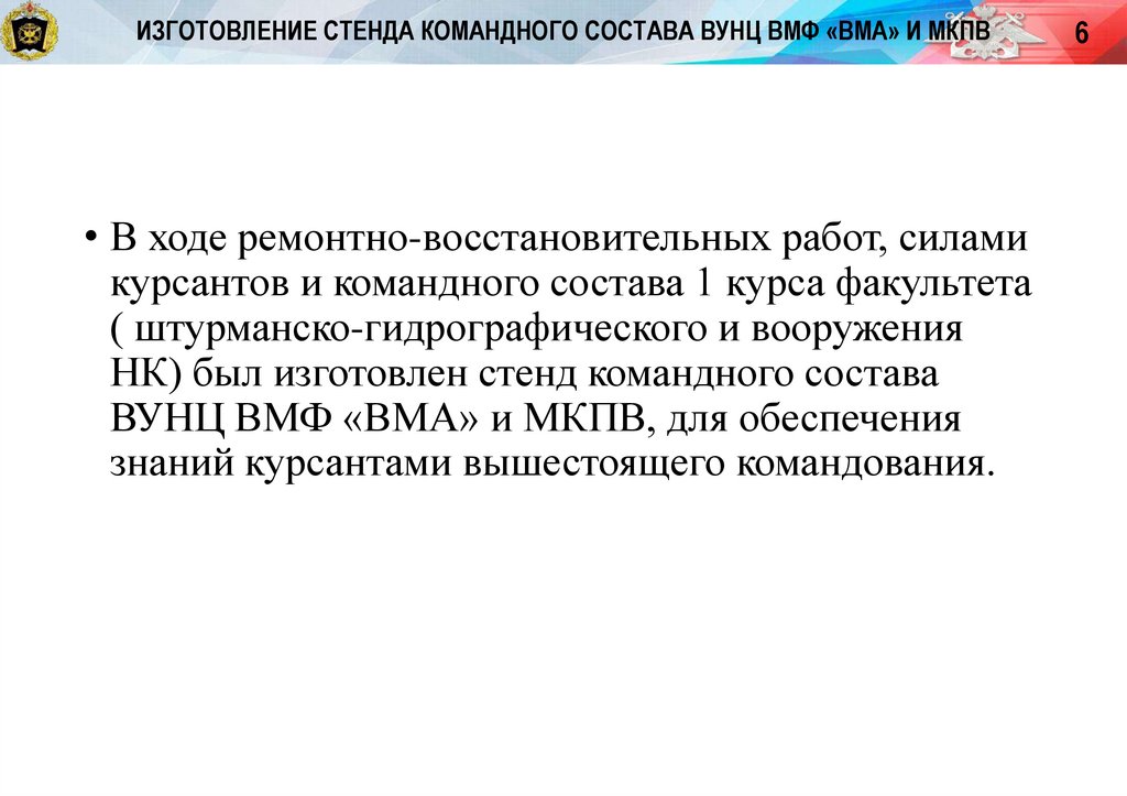 ИЗГОТОВЛЕНИЕ СТЕНДА КОМАНДНОГО СОСТАВА ВУНЦ ВМФ «ВМА» И МКПВ• В ходе ремонтно-восстановительных работ, силами