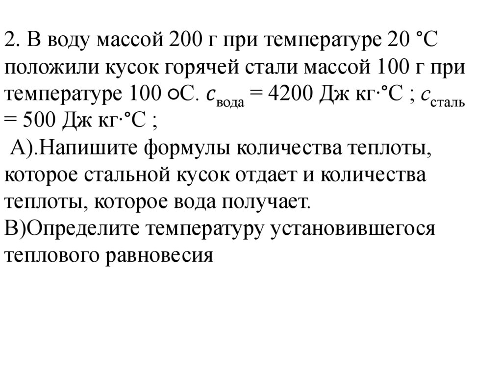 2. В воду массой 200 г при температуре 20 °Сположили кусок горячей стали массой 100 г при