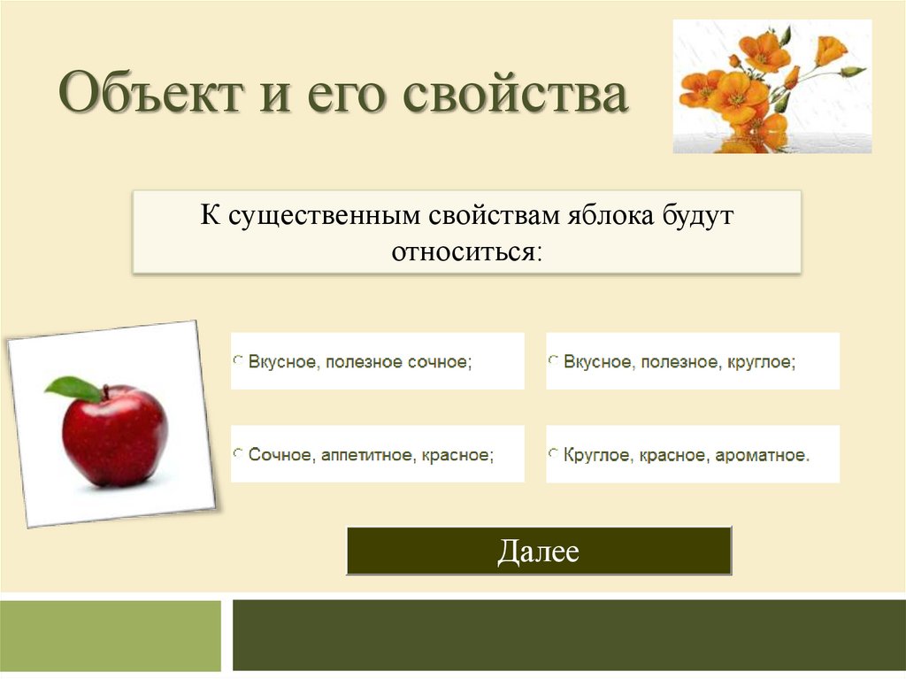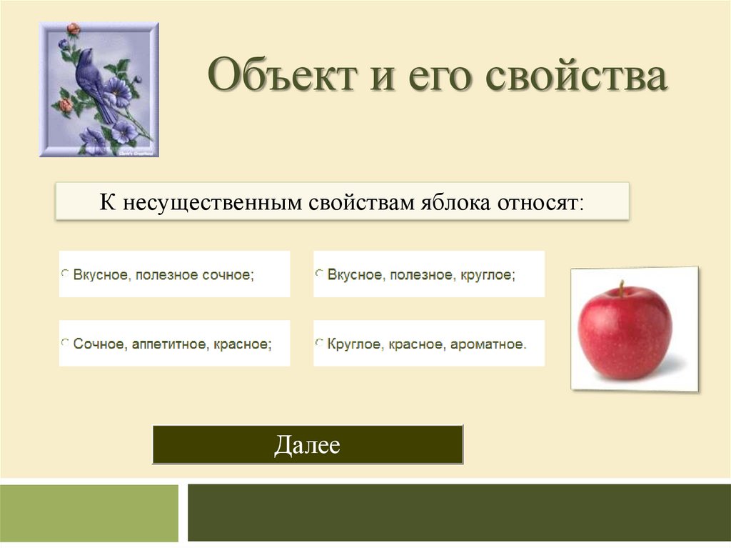 Объект и его свойстваК несущественным свойствам яблока относят: