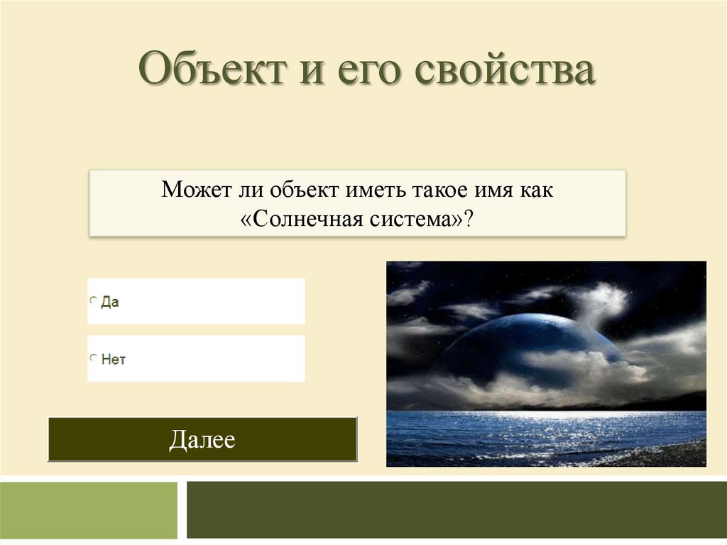 Объект и его свойстваОбщее название любого предмета, живого существа,