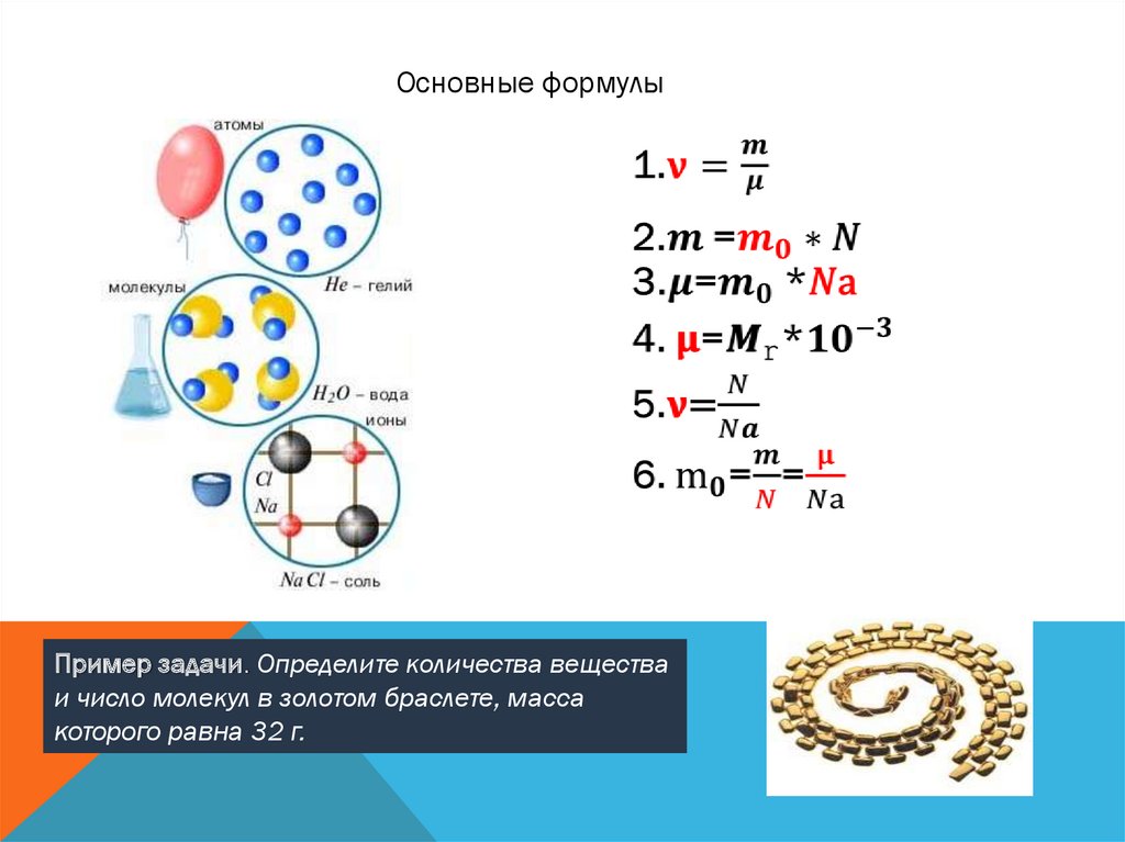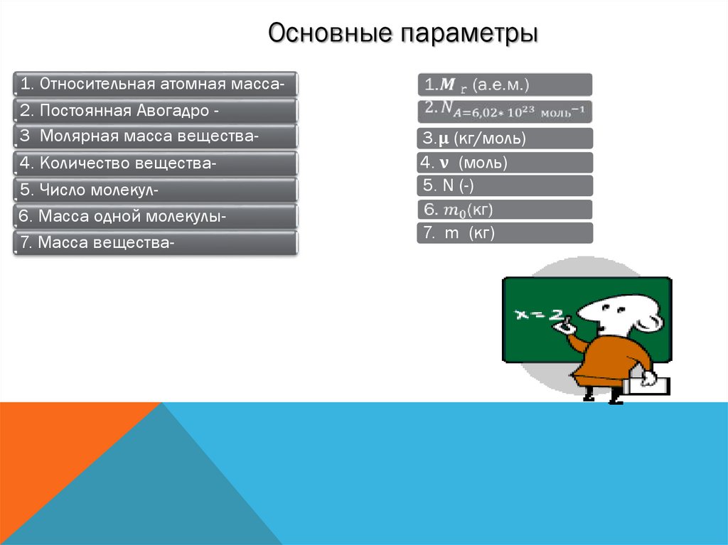 Основные параметры1. Относительная атомная масса2. Постоянная Авогадро 3 Молярная масса вещества4. Количество вещества5. Число молекул6. Масса одной молекулы7. Масса вещества-