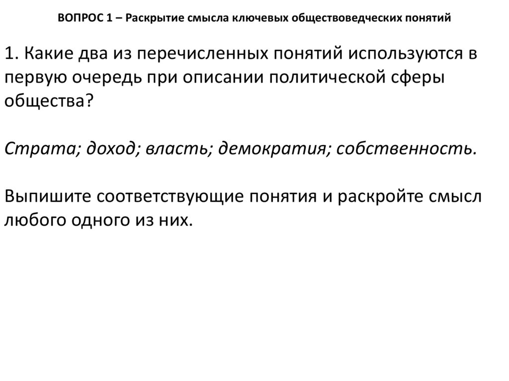 ВОПРОС 1 – Раскрытие смысла ключевых обществоведческих понятий1. Какие два из перечисленных понятий используются в