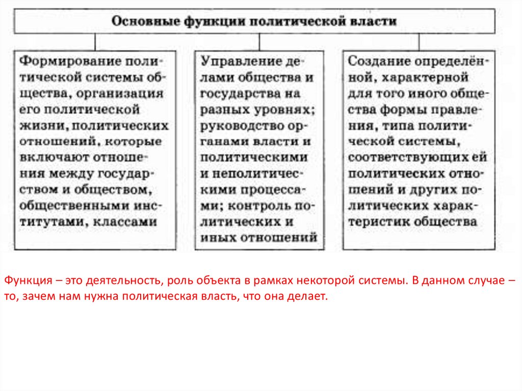 Функция – это деятельность, роль объекта в рамках некоторой системы. В данном случае –то, зачем нам нужна политическая власть, что она делает.
