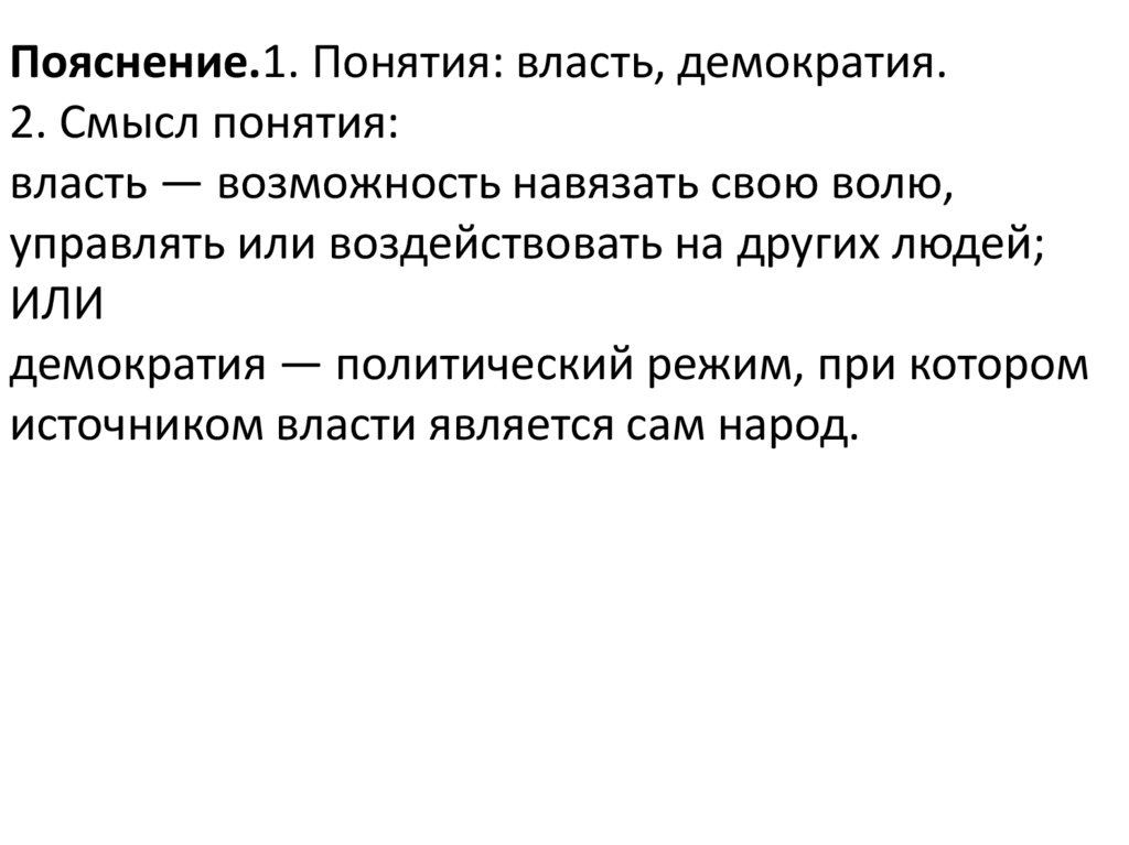 Пояснение.1. Понятия: власть, демократия.2. Смысл понятия: