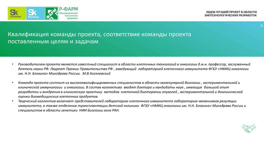 Руководителем проекта является известный специалист в области клеточных технологий в онкологии д.м.н. профессор, заслуженный