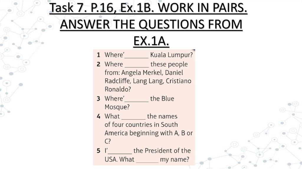 Task 7. P.16, Ex.1B. WORK IN PAIRS.ANSWER THE QUESTIONS FROM