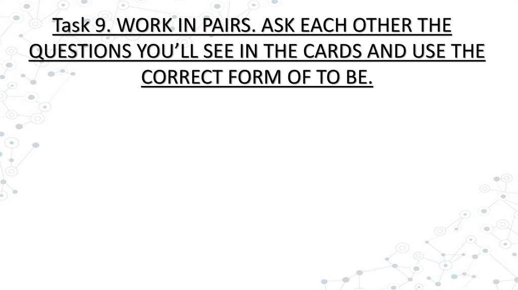 Task 9. WORK IN PAIRS. ASK EACH OTHER THEQUESTIONS YOU’LL SEE IN THE CARDS AND USE THE
