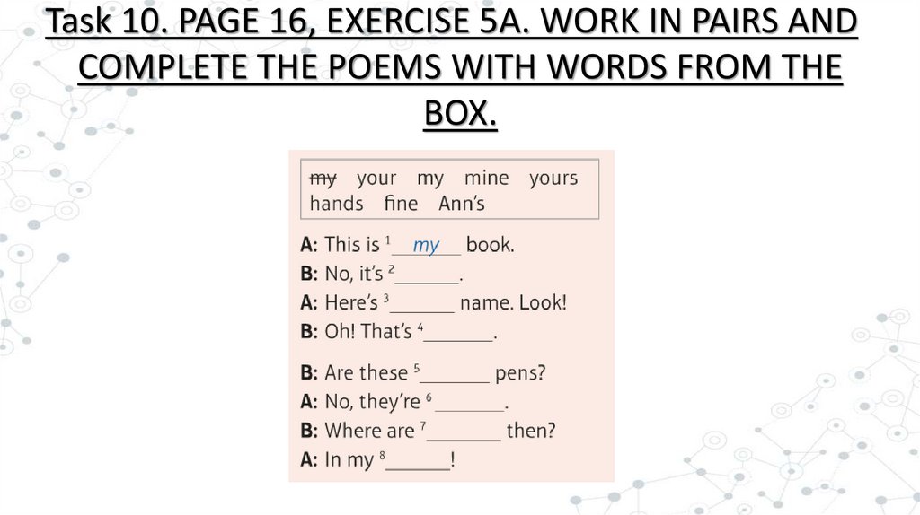 Task 10. PAGE 16, EXERCISE 5A. WORK IN PAIRS ANDCOMPLETE THE POEMS WITH WORDS FROM THE