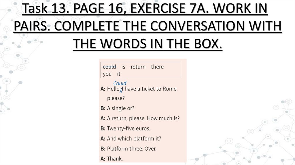 Task 13. PAGE 16, EXERCISE 7A. WORK INPAIRS. COMPLETE THE CONVERSATION WITH