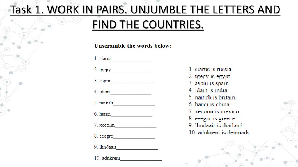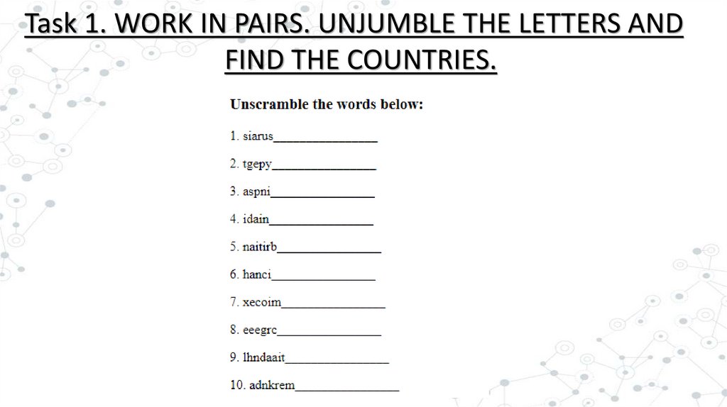 Task 1. WORK IN PAIRS. UNJUMBLE THE LETTERS ANDFIND THE COUNTRIES.