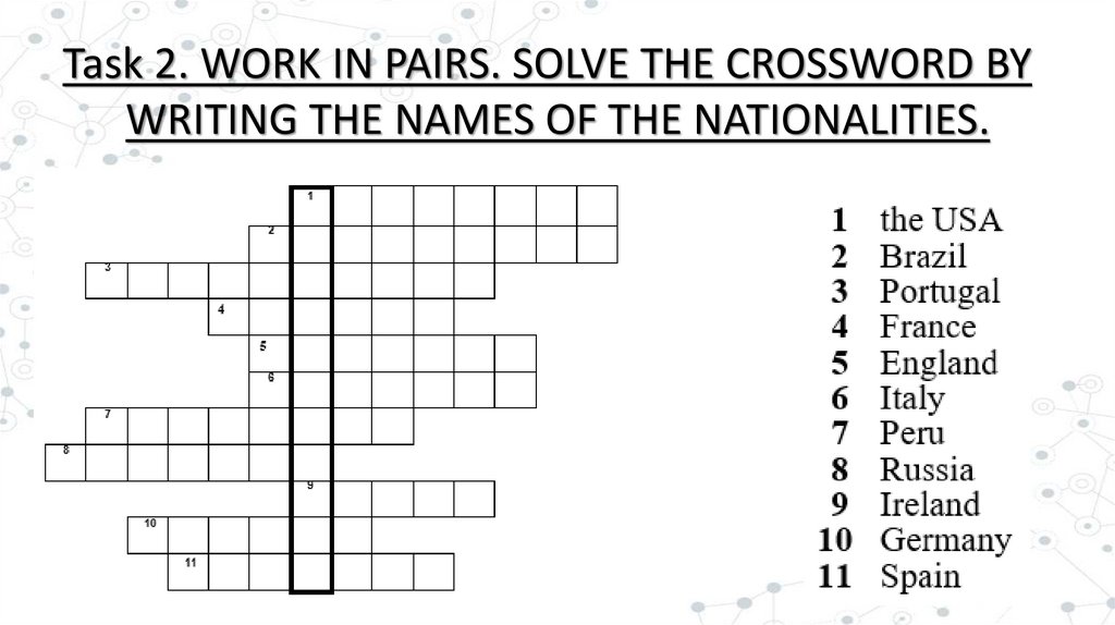 Task 2. WORK IN PAIRS. SOLVE THE CROSSWORD BYWRITING THE NAMES OF THE NATIONALITIES.