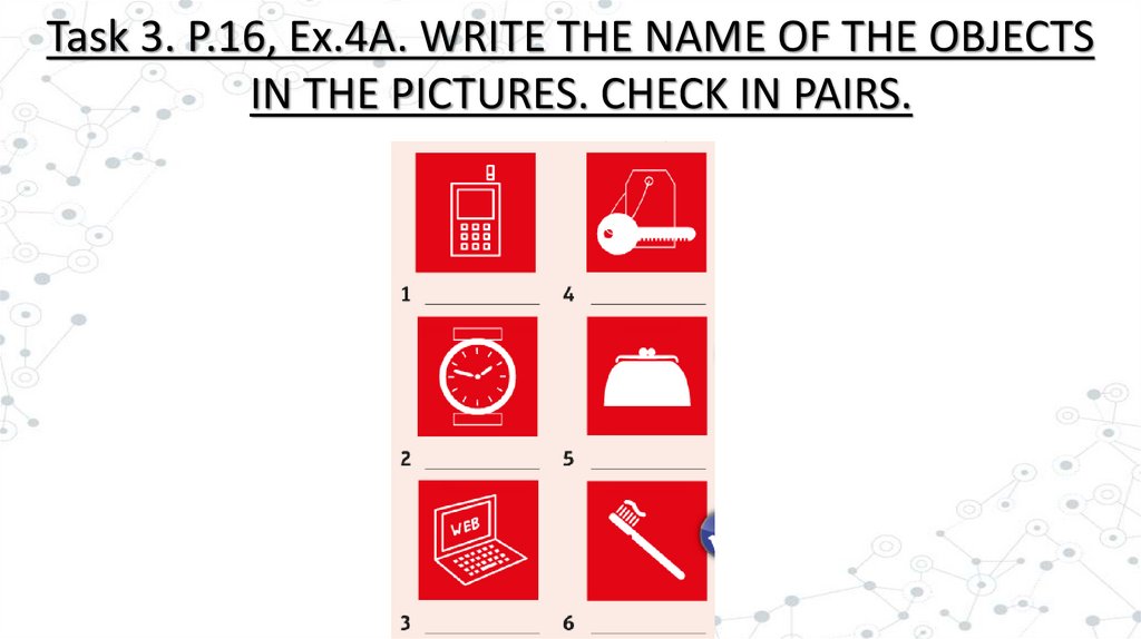 Task 3. P.16, Ex.4A. WRITE THE NAME OF THE OBJECTSIN THE PICTURES. CHECK IN PAIRS.