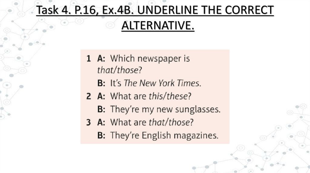 Task 4. P.16, Ex.4B. UNDERLINE THE CORRECTALTERNATIVE.