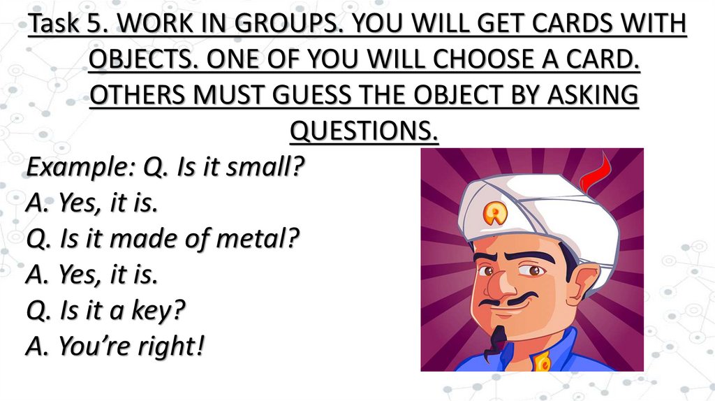 Task 5. WORK IN GROUPS. YOU WILL GET CARDS WITHOBJECTS. ONE OF YOU WILL CHOOSE A CARD.