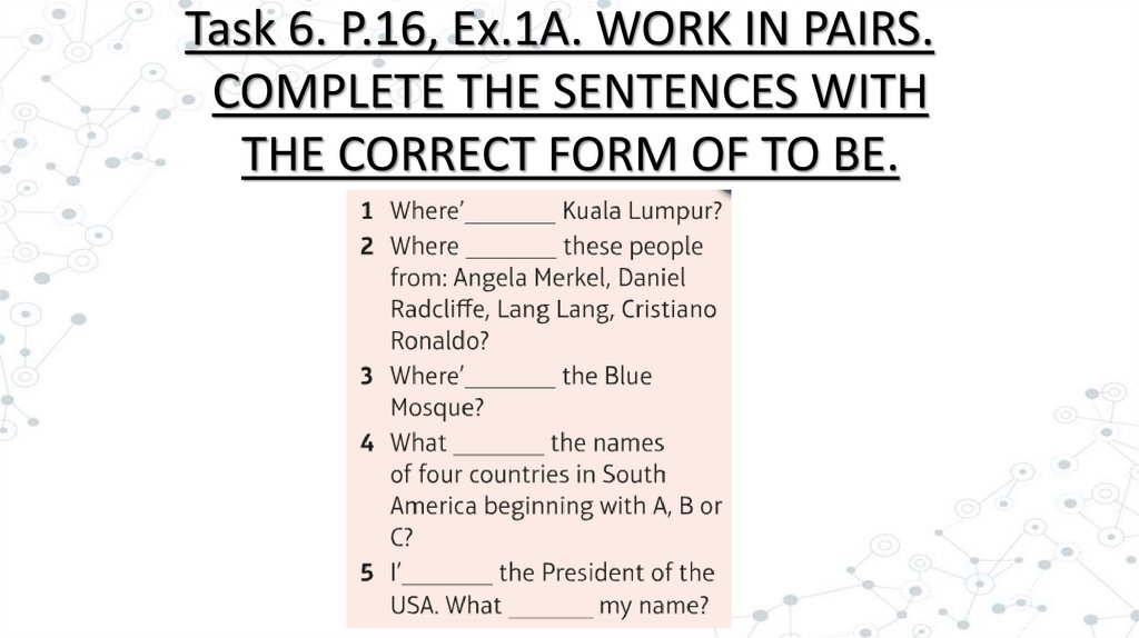 Task 6. P.16, Ex.1A. WORK IN PAIRS.COMPLETE THE SENTENCES WITH