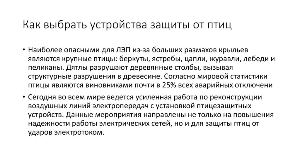 Как выбрать устройства защиты от птиц• Наиболее опасными для ЛЭП из-за больших размахов крыльев