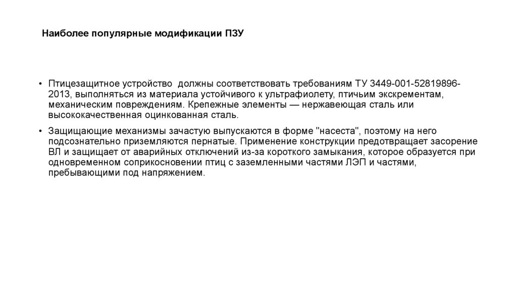 Наиболее популярные модификации ПЗУ• Птицезащитное устройство должны соответствовать требованиям ТУ 3449-001-528198962013, выполняться из материала устойчивого к ультрафиолету, птичьим экскрементам,